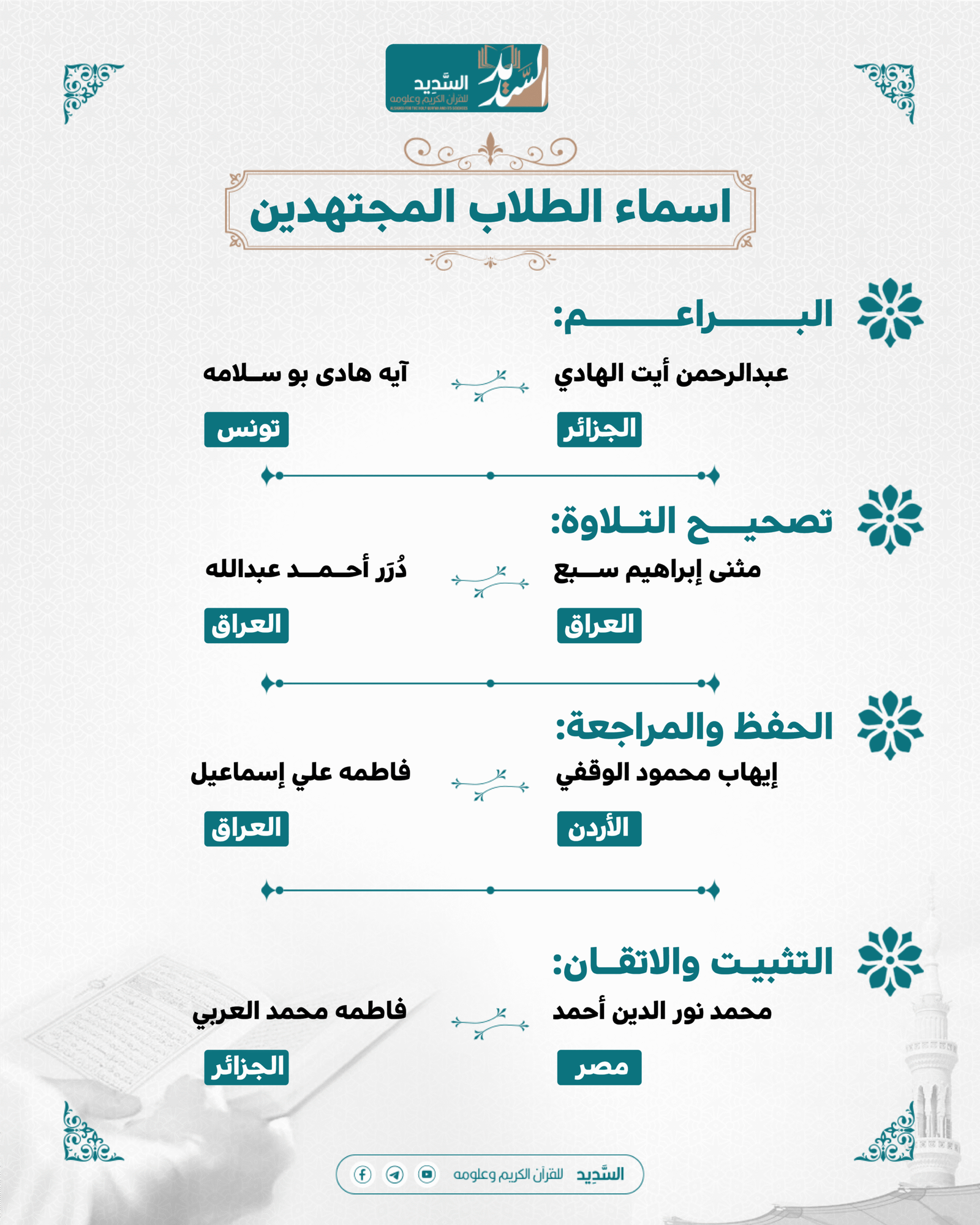 يسعدنا أن نشارك إنجازات طلابنا المجتهدين الذين تميزوا بإصرارهم واجتهادهم في تعلم القرآن الكريم. هؤلاء الطلاب يمثلون نموذجًا يُحتذى به في السعي نحو التميز، ونفخر بهم كقدوة ملهمة لكل من يتطلع لتحقيق النجاح في هذا المجال المبارك.